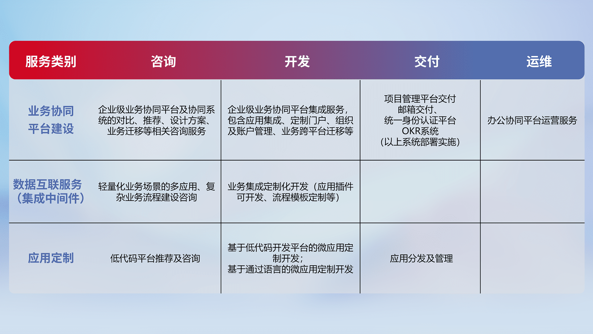 针对钉钉、、、、企微、、、、IDaas等平台级产品提供产品的规划、、、、方案、、交付、、、、定制化开发等服务,,,实现如统一协同办公、、、智能客户服务、、混合会议管理、、、、智能数据查询、、、、等业务场景,,,实现数字化转型。。。。