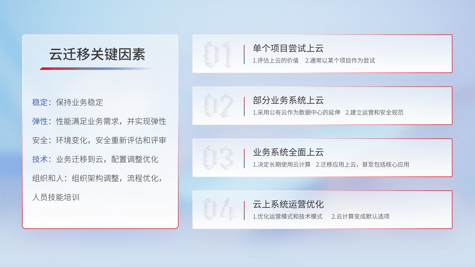 结合实际业务,,,,从规划设计、、、云平台选型、、云原生改造、、数据迁移、、、集成交付,,,迁移全过程为客户识别最佳上云路径,,,做好风险识别管理,,设计网络架构、、、、身份权限、、安全审计合规、、操作审计、、、、日志审计、、、、监控告警策略、、、多站点容灾设计等,,,对云上基础设施进行整体规划,,,提升IT治理水平,,,以满足弹性、、高可用、、、高性能的需求。。。。