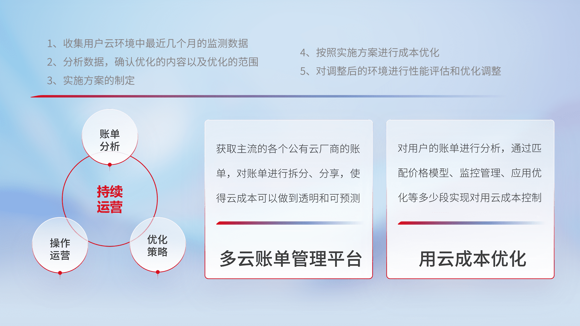 通过多云纳管,,,以统一的资源数据模型把客户的云资源进行抽象和封装,,,,进而实现对多云资源的统一操作,,,,保障云资源管理的可靠性、、、、稳定性与可用性。。量身定制化运维内容,,,,配置、、、开发运维、、补丁管理、、、、备份、、监控、、认证和访问管理、、、审计和日常巡检等,,保障在用云过程中的可靠度,,,,稳定度以及高可用率。。