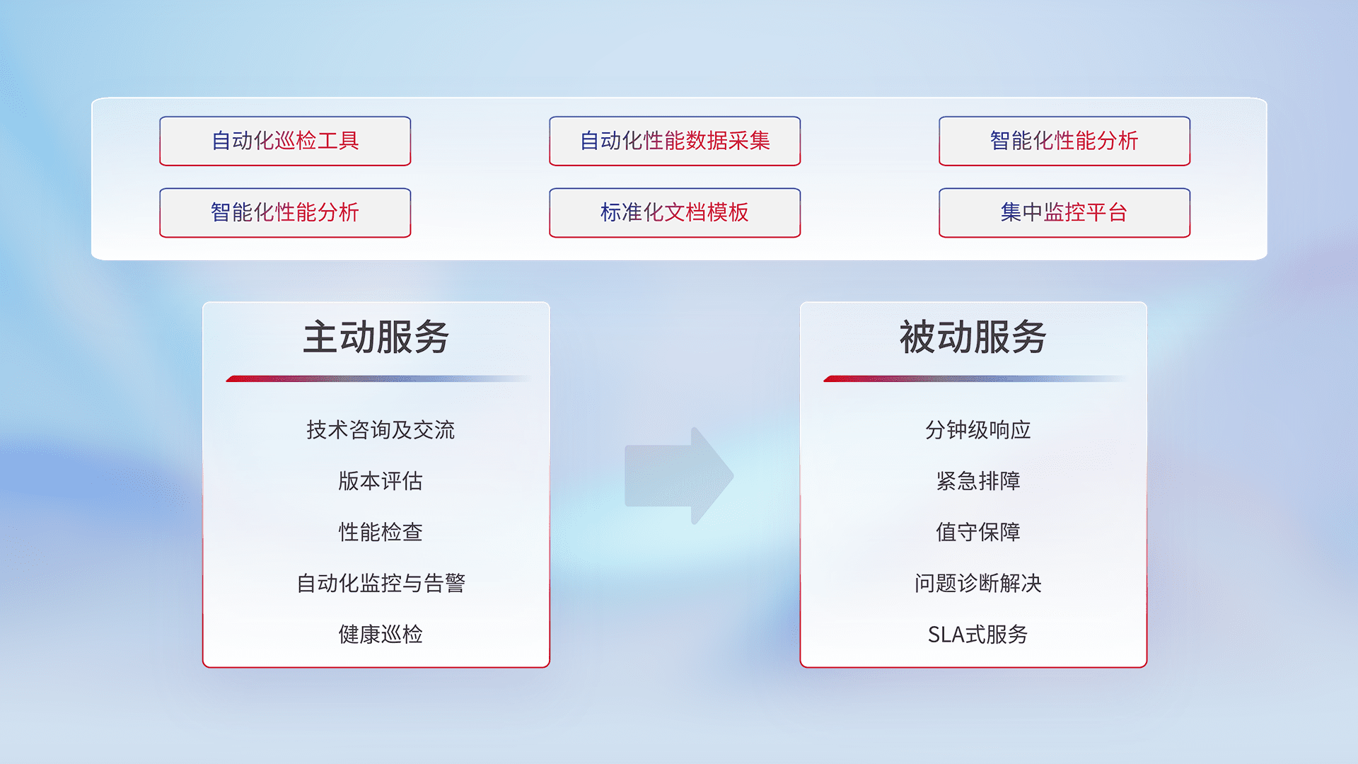 智能化工具和标准化文档,,保障服务质量,,,,提供主动服务(包含技术咨询、、、、版本评估、、性能检查、、自动化监控与告警、、、健康巡检)和被动服务包含(分钟级响应、、、、紧急排障、、值守保障、、、、问题诊断解决、、SLA服务)。。。。