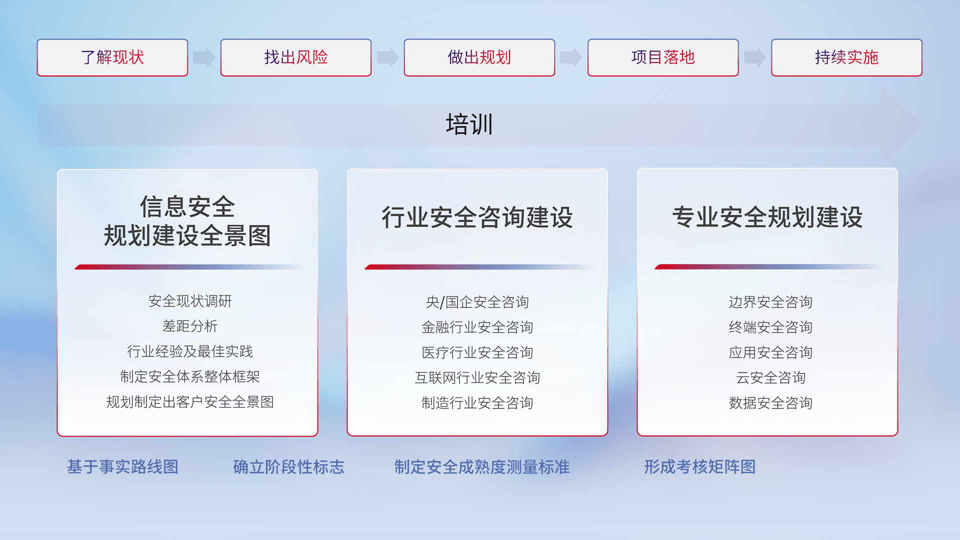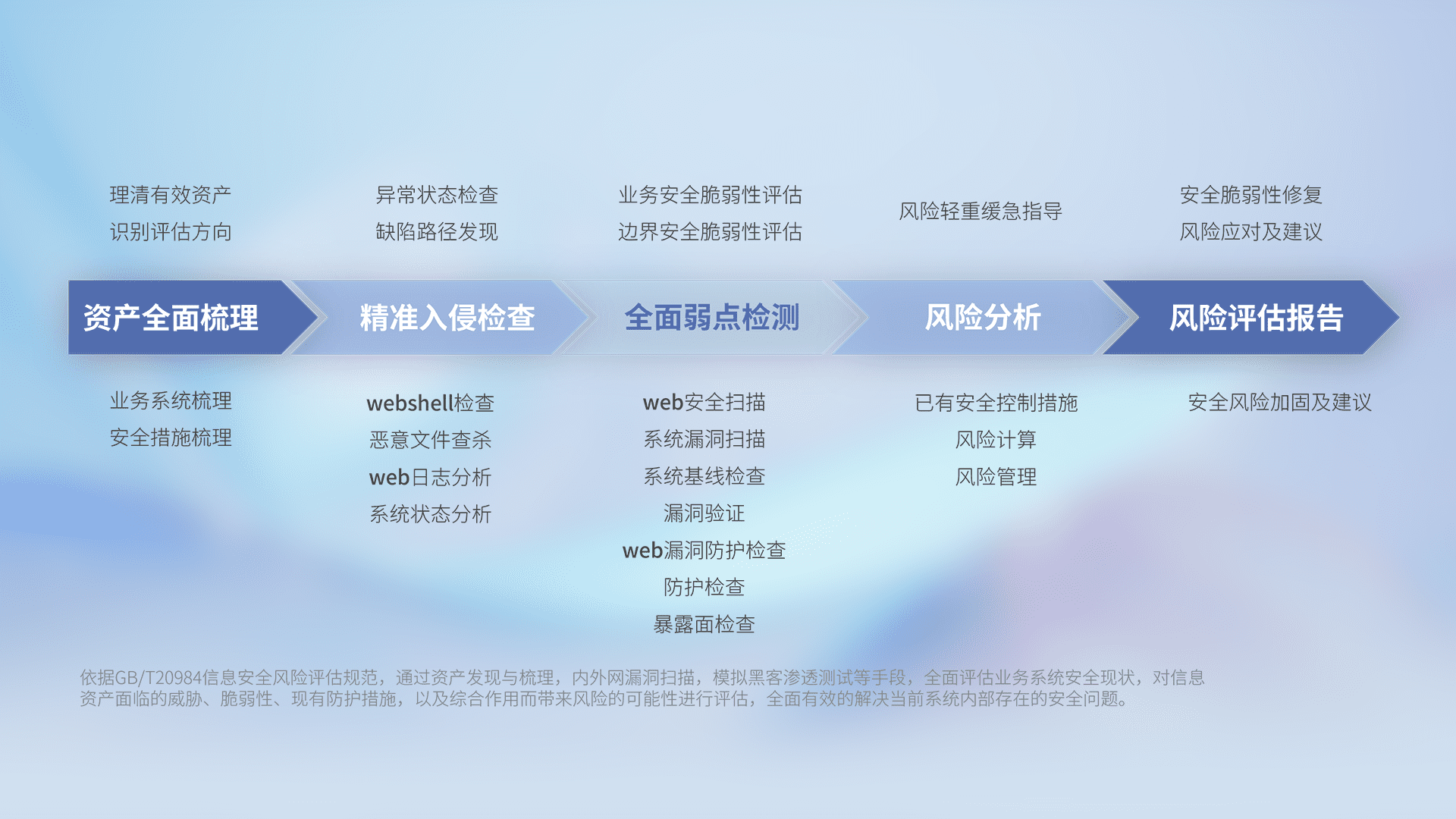 针对客户行业特性,,,以专业的安全服务+多厂商联合解决方案提供专属的一站式安全管理服务,,,帮助客户全面感知网络空间威胁,,,,基于识别、、检测、、、、分析、、、、防护、、、、监测、、、响应的服务理论模型,,,,从方案咨询、、集成交付、、、、评估验证、、、、优化加固、、运维运营,,,致力于为客户提供完整的闭环管理式安全服务。。。。以实战经验为客户打造高抵御风险的安全体系,,帮助客户发现威胁、、对抗威胁、、、、处置威胁,,,不断积累安全对抗能力,,持续保障数字化安全。。。。